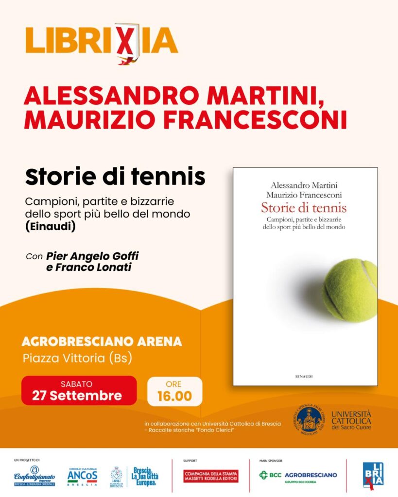 In occasione della nuova edizione della rassegna culturale Librixia, sabato 27 settembre alle ore 16.00, presso l’Agrobresciano Arena di Piazza Vittoria a Brescia, sarà presentato il libro Storie di tennis. Campioni, partite e bizzarrie dello sport più bello del mondo, scritto da Alessandro Martini e Maurizio Francesconi e edito da Einaudi. Promosso dalle ‘Raccolte Storiche’ dell’Università Cattolica, all’incontro dialogheranno con i due autori Pier Angelo Goffi, Responsabile della Biblioteca, e Franco Lonati, docente di Lingua e Letteratura inglese.