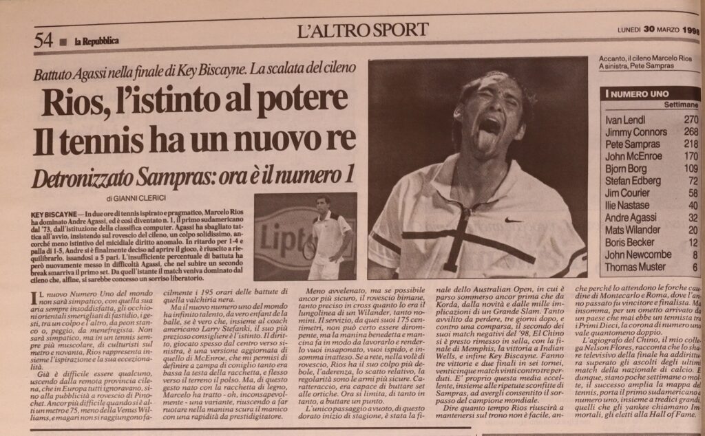 A proposito di corsa al primato, il Sunshine Double fu decisivo nel 1998, quando sul cemento di Key Biscayne (Miami) uno scatenato Marcelo Ríos, tennista cileno a dir poco atipico — sia per tecnica che per condotta in campo — batté il padrone di casa Andre Agassi in due set, decretando così la propria ascesa alla vetta del ranking ATP, fino a quel momento occupata da un altro campione americano, Pete Sampras. Ríos diventava così il primo sudamericano dal 1973, anno di istituzione della classifica computerizzata, ad occuparne il vertice (dopo di lui, ad oggi, solo il brasiliano Gustavo Kuerten tra il 2000 e il 2001). Naturalmente l’evento non sfuggì ai radar del nostro Gianni Clerici, che di quel match ci offrì, come suo solito, una cronaca pittoresca. L’articolo, corredato da una quanto mai azzeccata foto del cileno intento a fare la linguaccia, comparve sull’edizione di lunedì 30 marzo 1998 de La Repubblica: